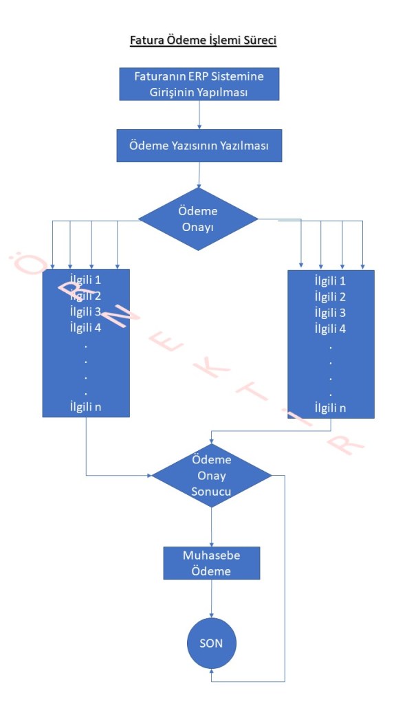 - Örnek sürecimizde fatura mevcut ERP sistemine işlendikten sonra muhasebenin ödemeyi yapabilmesi için ödeme yazısı oluşturularak fatura ile onaya gönderilir. Onaylar alındıktan sonra muhasebeye gelir ve muhasebe de ödemeyi gerçekleştirerek süreci bitirir.